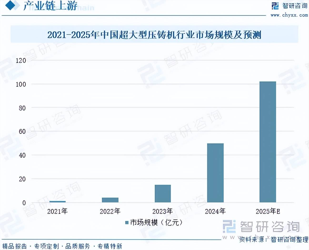 超大型压铸机是压铸工夫的主要成长对象,行为一体化压铸的焦点设置,超大型压铸机具有极高的工夫和市集代价。正在环球边界内,压铸机市集透露出寡头垄断的形式,可以领域量产6000吨以上大型压铸机的创制商屈指可数。古板汽车铝铸件创制所操纵的压铸机吨位根本正在4000吨以下。跟着一体化压铸工夫的振起,力劲集团于2018年推出Giga Press 6000T超大吨位压铸机,并于2020年发端供应特斯拉,从而拉开了超大型压铸机时间的序幕。眼前环球仅有四家压铸设置商具备供给6000吨以上超大型压铸机的才干,分袂是力劲集团、瑞士布勒、海天金属和伊之密。跟着一体化压铸工夫操纵边界的接连伸张,市集对更高锁模力、更高精度的超大型压铸机需求日益紧迫。数据显示,中邦超大型压铸机行业市集领域从2021年的1.4亿元增加至2024年的50亿元,年复合增加率为229.32%,估计2025年中邦超大型压铸机行业市集领域将增加至102亿元。