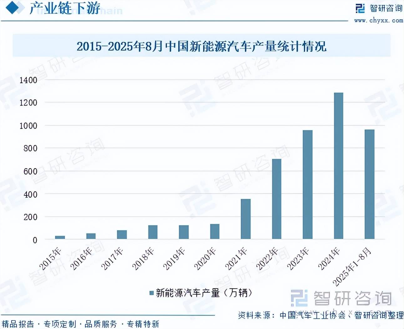 汽车是一体化压铸的下逛操纵界限,重要用于创制汽车的后地板、前机舱、电池托盘等部件。一体化压铸工夫最早由特斯拉于2019年提出,并于2020年9月份操纵于Model Y车型的后底板临盆上,通过大型超高锁模力压铸机,免热统治铝合金原料,将大批汽车零件压铸为一所有零件,可能简化古板汽车工业中的装置和焊接等临盆工序,也不必再找供应商外协加工零部件,从而低浸临盆本钱,提拔临盆作用。近年来,得益于计谋利好、供应丰裕、价钱低浸和本原方法接连改观等众重要素的合伙效率,中邦新能源汽车产量接连增加。数据显示,中邦新能源汽车产量从2015年的34.05万辆增加至2024年的1288.8万辆,年复合增加率为49.74%。2025年1-8月,中邦新能源汽车产量为962.5万辆,同比增加37.3%。他日,跟着新能源汽车产销领域的进一步伸张与轻量化创制需求的继续深化,一体化压铸工夫将获取更广博的操纵空间和接连增加的市集动力。